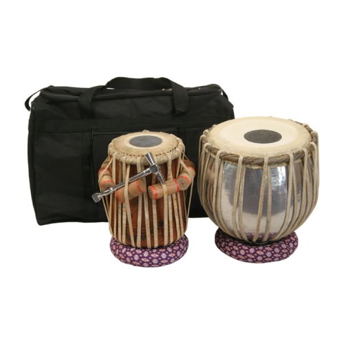 Standard wooden tabla is paired with a nickeled brass bayan. Both are strap tuned. Includes the standard soft case, cushions, covers, and tuning hammer. Cushion colors and patterns may vary.